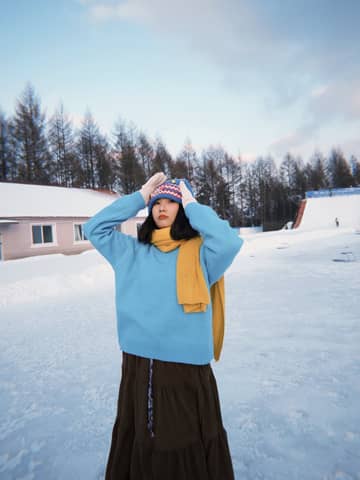 Young woman in winter attire stands in snowy landscape with pine trees.