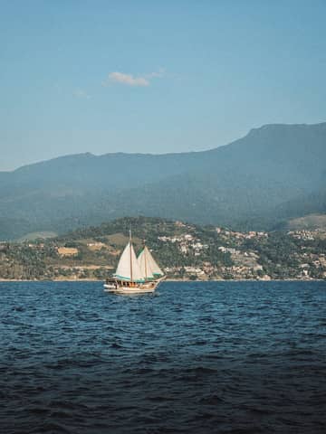 A serene view of yachts sailing on the Aegean Sea with mountainous backdrop.