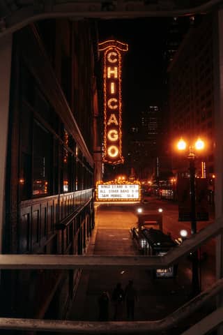 Iconic Chicago Theater lit up at night on a bustling street in Chicago.