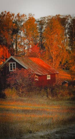 Orange cabin with a misty mountain in the backdrop, creating a serene and tranquil scene.