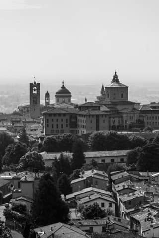 A scenic black and white panorama of Bergamo's historic architecture and rooftops.