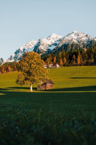 Picturesque autumn scene with snow-capped mountains, a lone tree, and a rustic cabin in Steiermark, Austria.