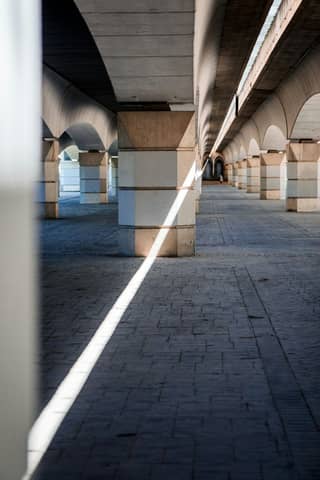 A concrete underpass with symmetrical arches and a beam of sunlight creating a striking visual effect.