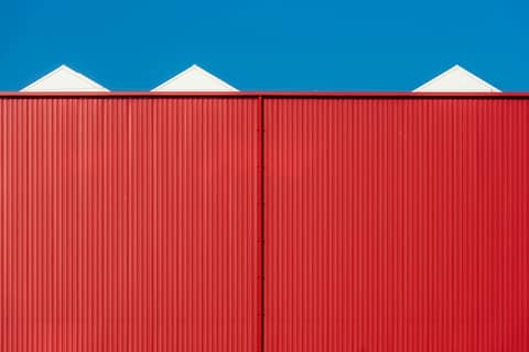 Minimalist photo of a red building facade against a bright blue sky, showcasing clean lines and vibrant colors.