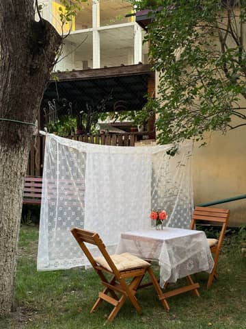 Cozy outdoor café with yellow chairs and open window under 'Daisy' sign.