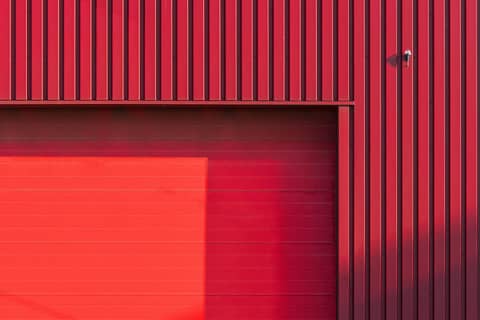 A sleek minimalist red facade with a large garage door, perfect for industrial themes.
