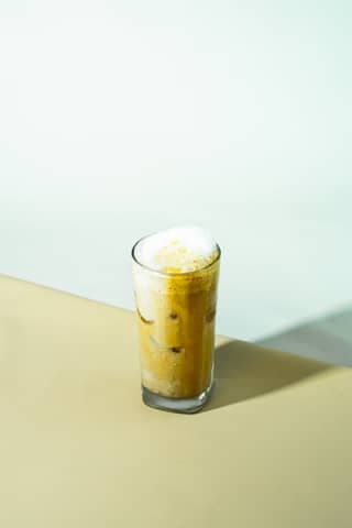 Refreshing iced matcha latte on marble slab with a bamboo whisk, surrounded by plants.