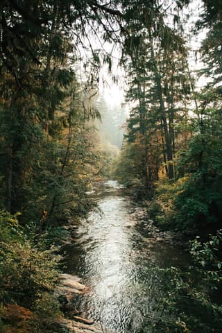 Peaceful forest path surrounded by towering trees and lush greenery, perfect for nature retreats.