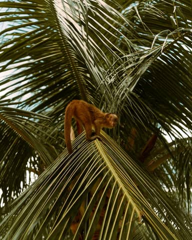 A monkey climbs a palm tree in the lush Brazilian jungle, showcasing its natural habitat.