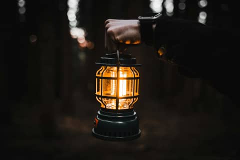 A warm lantern light breaking the darkness of a forest, held by a hand.