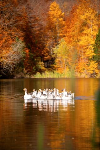 Group of ducks swim on a serene lake surrounded by vibrant fall foliage.