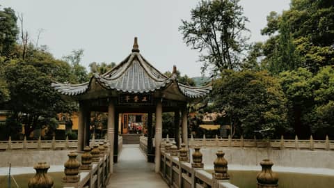 Traditional Chinese pavilion in lush garden setting during summer, offering a peaceful and cultural atmosphere.