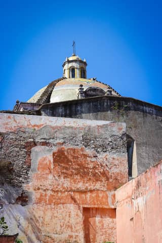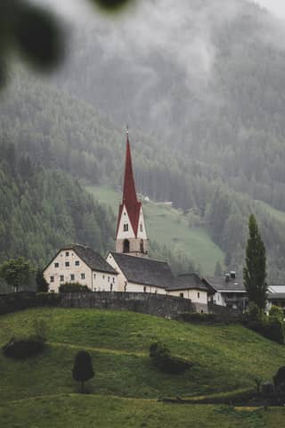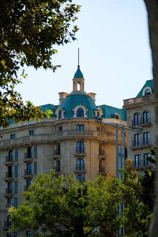 A classic building with green domes surrounded by trees, showing intricate architectural design.