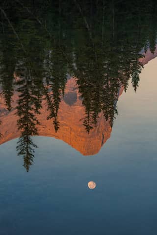 A serene twilight scene with a full moon over the Siberian taiga near Dvurechensk, Russia.