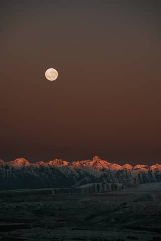 Majestic view of a full moon rising above snow-capped mountains at dusk.