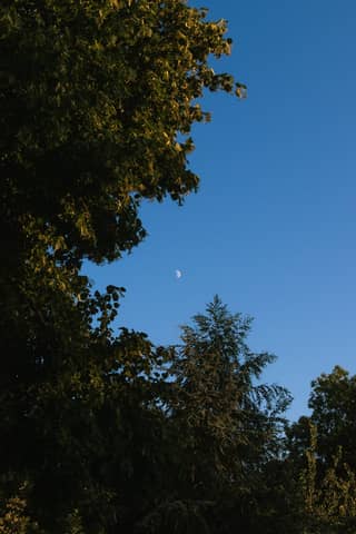 A serene twilight sky with a crescent moon above a building in Merida, Yucatan.
