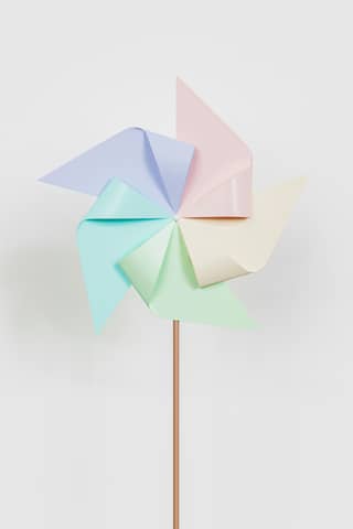 A paper pinwheel on a wooden stick