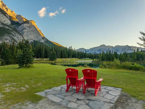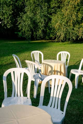 White plastic chairs and tables arranged outdoors in Pierrefonds, summertime ambiance.