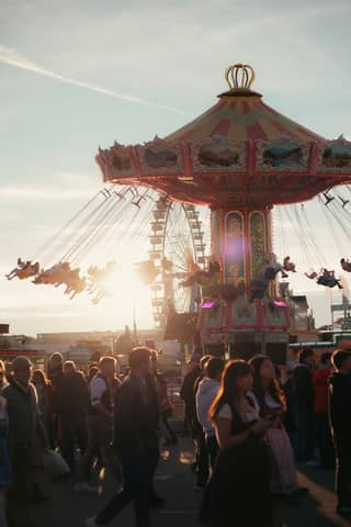 Enjoy the vibrant atmosphere of Munich Oktoberfest with a scenic carousel ride at sunset.