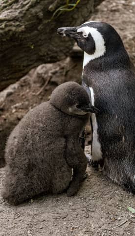 A Magellanic penguin with fluffy chick resting outdoors by a tree.