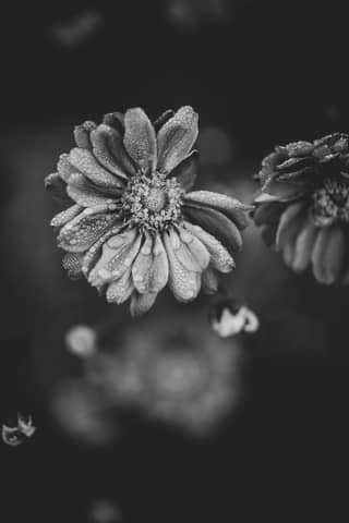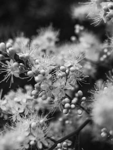 Close-up black and white image capturing detailed textures of blooming flowers.