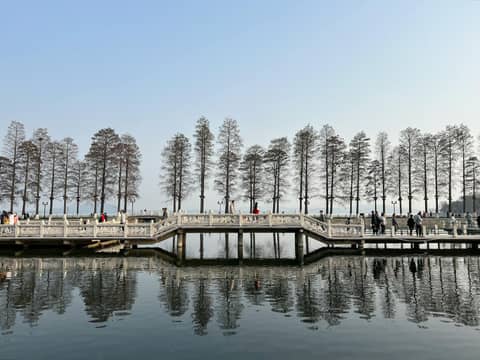 Tranquil lakeside scene with trees and walkway reflection in clear water on a sunny day.
