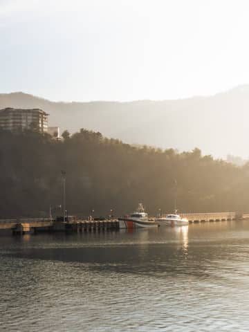 A peaceful lakeside scene with boats docked at a pier during sunrise, surrounded by misty hills.