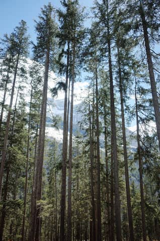 Stunning view of tall pine trees in Kandersteg, Switzerland, with majestic mountains peeking through.