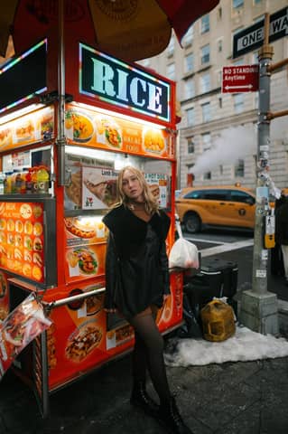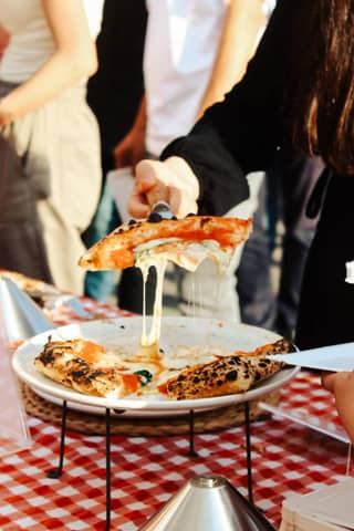 A delicious slice of pizza being served with melting cheese at an outdoor event.