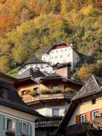 Discover the picturesque architecture of Hallstatt, Austria, nestled against vibrant autumn foliage.