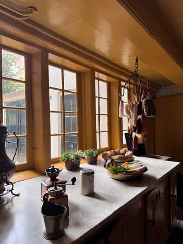 A charming kitchen in Amsterdam with plants, spices, and natural light, displaying timeless charm.