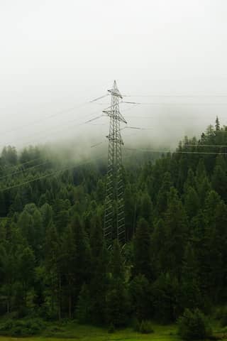 A towering power line against a colorful sky in Aguascalientes, Mexico captures the industrial landscape.