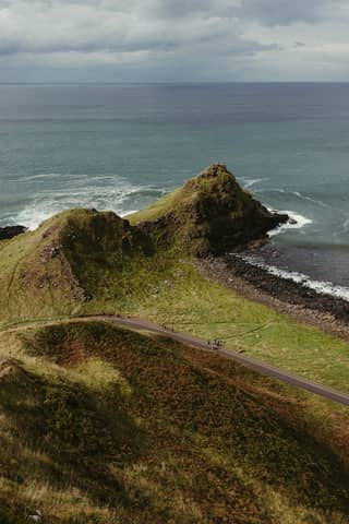 A stunning aerial view of the rugged coastline of Giant's Causeway, showcasing lush green hills and deep blue ocean.