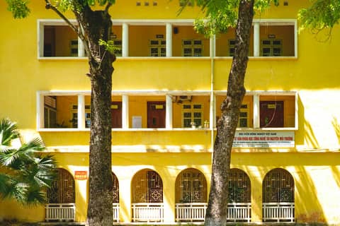 Yellow colonial-style university building surrounded by lush greenery in Hanoi, Vietnam.