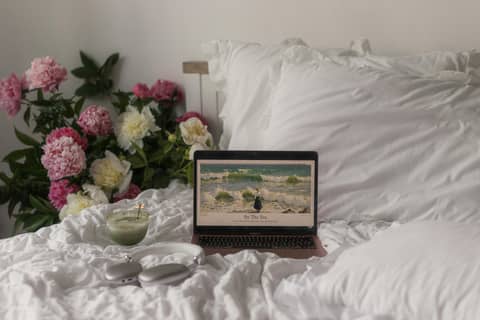 Warm cozy setup with candle, book, and pink rose on a bed.