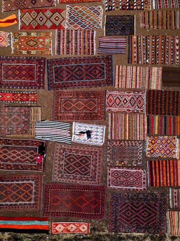 A top-down view of various traditional rugs arranged on the ground, showcasing vibrant patterns and colors.