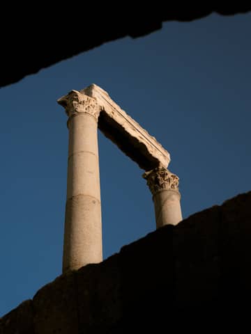Explore the majestic ruins of an ancient temple with Corinthian columns and clear blue skies.