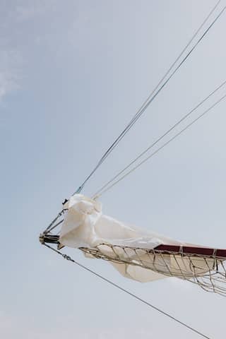 A sailboat's mast and boom with sails in Chicago's open sky.