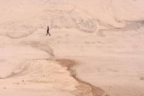 Close-up of wavy sand dune patterns under warm sunlight, creating a natural abstract art.