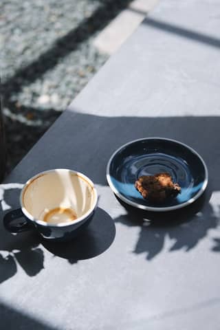 Warm sunlight illuminating a coffee cup in ONIBUS Cafe, Tokyo.