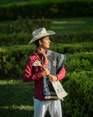 A man wearing traditional Mexican attire holding a flower outdoors, showcasing vibrant cultural heritage.
