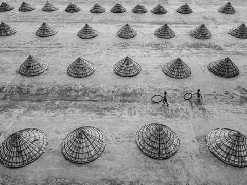Close-up of hand holding assorted seashells by the beach with waves in the background.