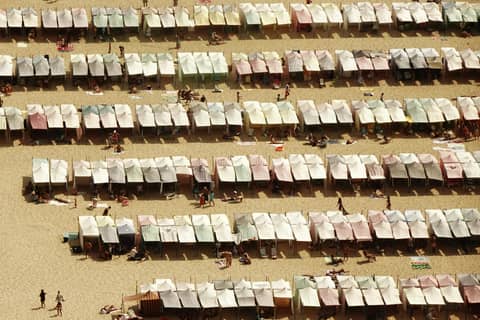 Aerial view of rows of colorful beach tents on a sunny sandy beach with people relaxing.