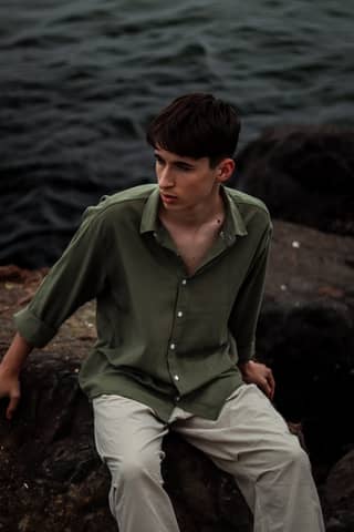 Young man in casual wear sitting on rocks by the sea in Mudanya, TΓΌrkiye.