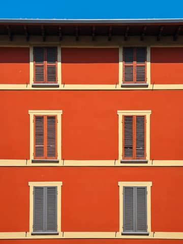 Bright orange facade of an Italian building with classic shuttered windows in Rastignano, Emilia-Romagna.