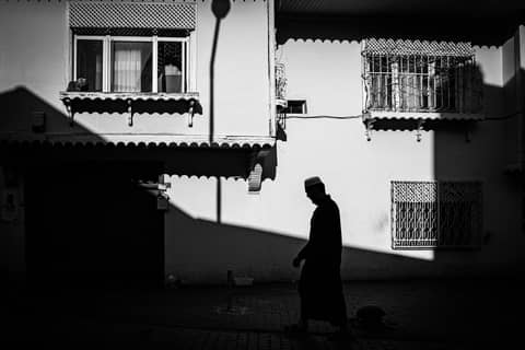 A black and white photo of a solitary man walking, casting shadows on Bursa's walls.