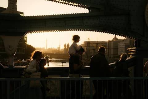 Black and white view of a river and landscape framed by leaves, capturing urban and nature elements.
