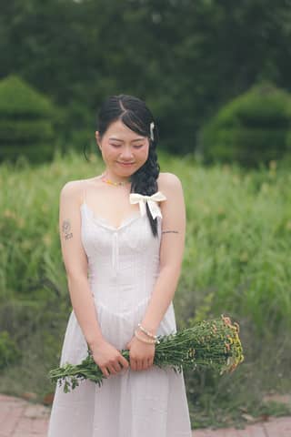 Smiling woman in a white dress holding wildflowers outdoors in a lush garden.