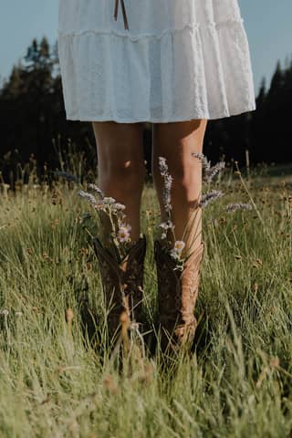 Two women holding hands and walking through a wooded area in traditional Austrian attire.