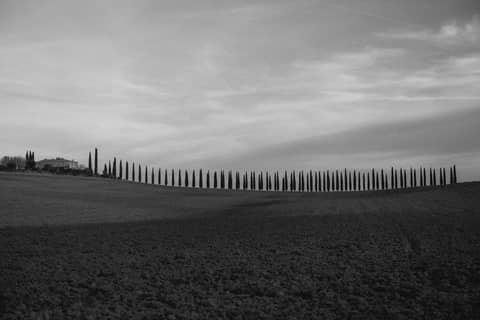 Black and white panorama of a Tuscan field lined with cypress trees.